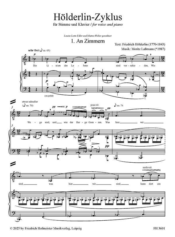 Der Liederzyklus umfasst sechs kurze Gedichte des in Lauffen am Neckar geborenen Dichters Friedrich Hölderlin (1770-1843), die sich durch unterschiedlichste Charakteristika und Stimmungen auszeichnen.<br>Eines haben sie jedoch alle gemeinsam: Sie thematisieren die Vielfalt des Lebens und zeigen zugleich eine tiefe Verbindung zur Natur sowie zur menschlichen Erfahrung auf. Dabei lassen sie die Spannungen und inneren Widersprüche erahnen, die Hölderlins bewegtes Leben und seine poetische Ausdruckskraft prägten.<br>Moritz Laßmann ließ sich beim Komponieren von den Worten der Gedichte leiten, die sowohl den Weg als auch das Ziel für die Musik vorzeichneten. Die Harmonik entwickelte sich durch das Aushören am Klavier, was auch die Linien der Gesangsstimme beeinflusste. So entstand ein harmonisches Zusammenspiel von Wort und Musik, das die emotionale Tiefe der Gedichte widerspiegelt.